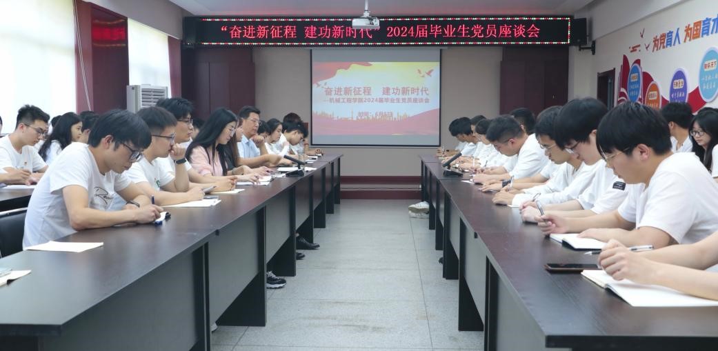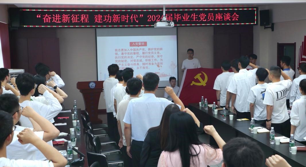 为深入学习贯彻党的二十大精神和习近平新时代中国特色社会主义思想,扎实推进党纪学习教育,进一步落实学校关于毕业生思想教育及文明离校系列活动通知要求。6月5日下午,002cc白菜资讯首页地址在临潼校区骊山校园学院会议室召开“奋进新征程,建功新时代”2024届毕业生党员座谈会。公司党委书记郭小平、副书记尹弘,辅导员杨芝、骆佳录以及全体2024届毕业生党员共80人参加座谈会。座谈会由尹弘主持。