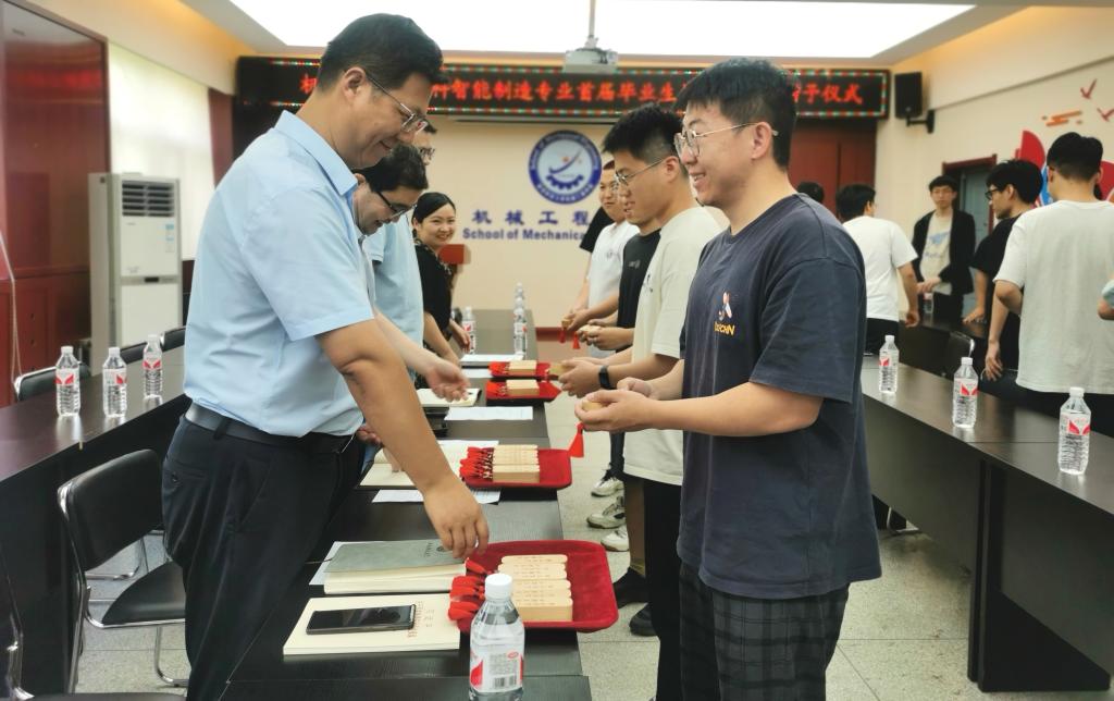 经理曹现刚在仪式上做总结讲话,结合学院人才培养方案与大家共同回顾了智能制造新工科专业设立的背景以及建设情况,充分肯定了同学们四年来在专业素质能力培养方面取得的成就。并结合学院十四五规划目标,阐释了中国制造2025大背景下进一步完善智能制造新工科专业课程体系建设、知识传授、技能训练、品格塑造等方面的人才培养的重大现实意义。“未来可期、不负韶华”专属毕业纪念品寓意深刻,他勉励同学们要始终坚定理想信念和成才自信,作为新工科智能制造专业首届毕业生,要身体力行传承“祖国利益高于一切的校训”,争做懂工艺流程、数据分析、人工智能等融合机械工程、计算机科学与技术、控制工程等多学科专业、勇于创新实践的复合型人才,为中华民族伟大复兴、为中国式现代化强国建设贡献自己力量。