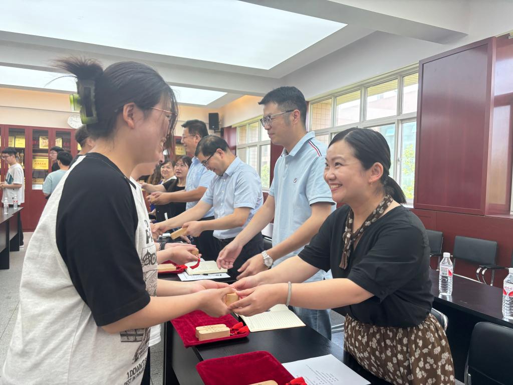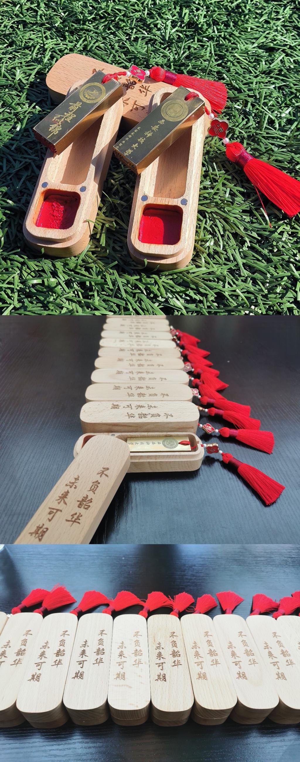 活动开始,辅导员杨芝领学传达习近平总书记五四青年节寄语新时代青年,奋力书写为中国式现代化挺膺担当的青春篇章。解晖老师介绍了“未来可期、不负韶华”专属毕业纪念品制作设计、材质考虑以及软件编程、机床加工、台磨机打磨、激光机打标、表面处理、包装等工艺流程,充分肯定了同学们在制作过程中的积极表现。与会领导、老师向智能制造专业毕业生赠予纪念品,对同学们顺利完成学业表示祝贺,对同学们奔赴新征程表达祝福。