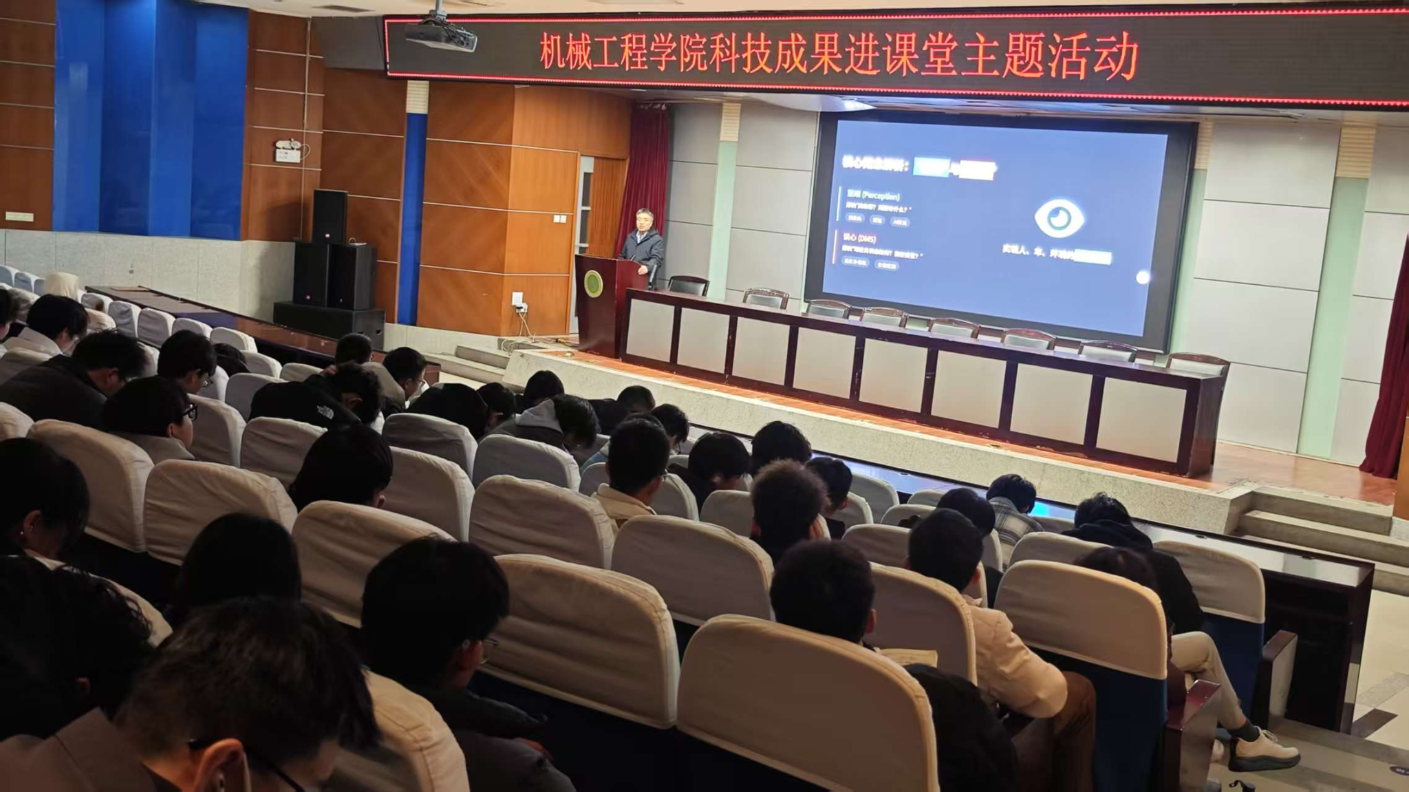 报告第二阶段,赵栓峰教授以《新能源车辆的 “慧眼” 与 “读心术”— 无人驾驶环境感知与驾驶人状态监测技术》为题做报告。他围绕车辆工程 “电动化、智能化” 变革核心,从多源传感器的物理机理与数据特性切入,对比分析了视觉主导、多模态融合等主流技术路线的性能边界。通过 BEVFormer、Occupancy Network 等深度学习模型应用案例,深入解析了高精度目标检测与语义分割等前沿算法如何实现感知精度与实时性的平衡,并延伸介绍了驾驶人行为识别、疲劳监测、人机共驾决策等关键工程环节,前瞻性探讨了大模型知识驱动、舱驾一体中央计算架构等下一代技术发展趋势,凸显了环境感知与状态监测系统在无人驾驶领域的 “慧眼” 与 “读心” 核心价值。本次报告会主题突出、信息饱满且案例鲜活,兼具理论深度与实践指导性强,助力员工开阔视野,增强对行业前沿的认识和了解,进一步坚定学科自信和成才自信。
