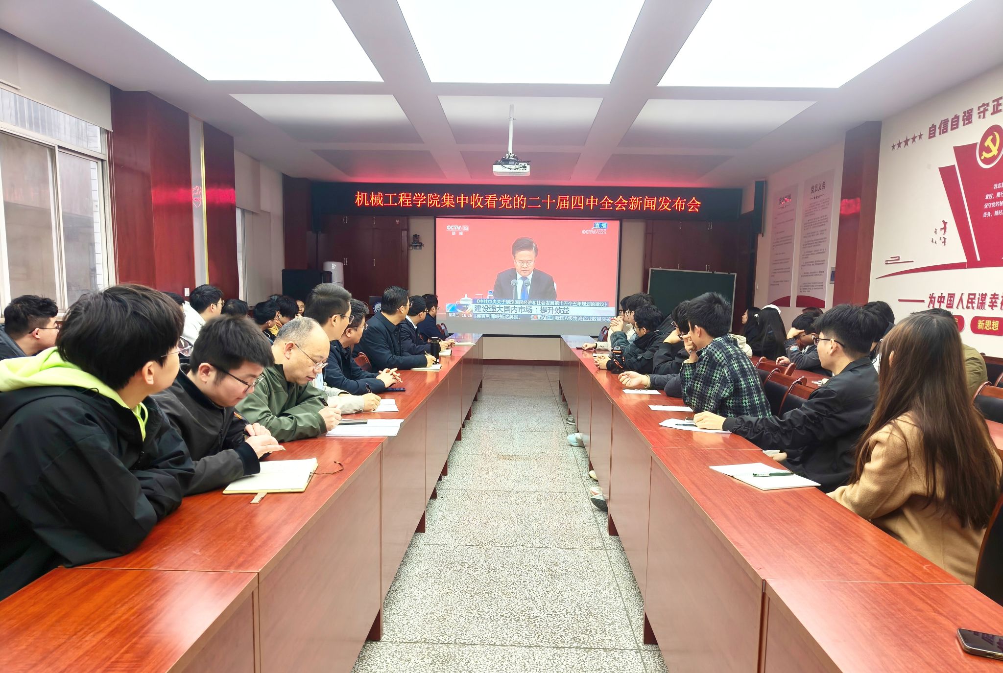 随着发布会对党的二十届四中全会精神的深入解读,屏幕前的师生们聚精会神、听得格外认真。当听到“统筹教育强国、科技强国、人才强国建设”“壮大实体经济根基”“建设能源强国”“深入实施创新驱动发展战略”人工智能赋能经济社会发展成效显著”等内容时,大家频频点头,在权威声音中找到了个人发展与国家需求的契合点,更坚定了奋进的方向。“十五五”是基本实现社会主义现代化夯实基础、全面发力的关键时期,具有承前启后的重要地位。通过收看,与会师生进一步了解了党的二十届四中全会部署要求、全会召开的重大意义、全会审议通过的重要文件以及党和国家事业取得的重大成就、未来发展的战略部署和目标任务等内容。