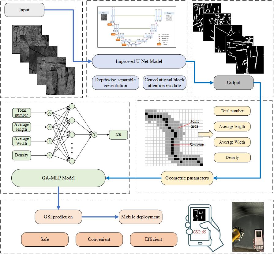该研究聚焦于如何通过自动化算法提升巷道掌子面岩石节理地质强度指标(GSI)预测的客观性与效率这一核心研究问题,通过改进U-Net模型与多层感知器(MLP)结合的深度学习方法,结合实证分析与移动应用部署测试,深入剖析了岩石节理图像语义分割、几何参数计算及GSI预测的完整流程,有效解决了传统GSI识别依赖人工经验导致的客观性不足、效率低下等痛点问题,为巷道工程地质条件表征与开挖技术优化相关领域的发展提供了极具价值的参考。文章从模型改进到实验验证,再到工程应用,对巷道工程岩石力学特性分析的理论与实践发展具有重要的指导意义。